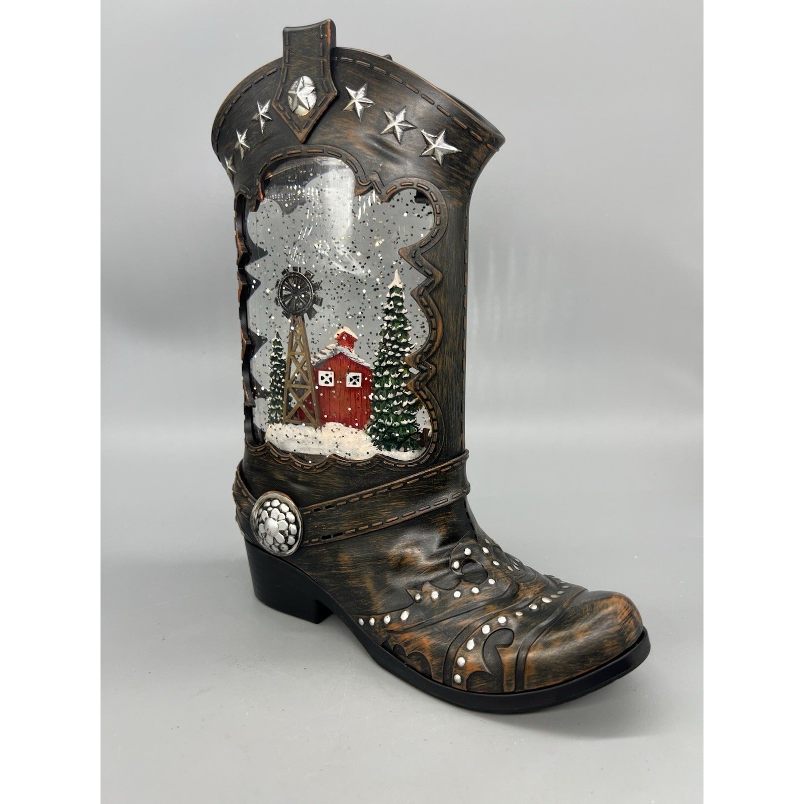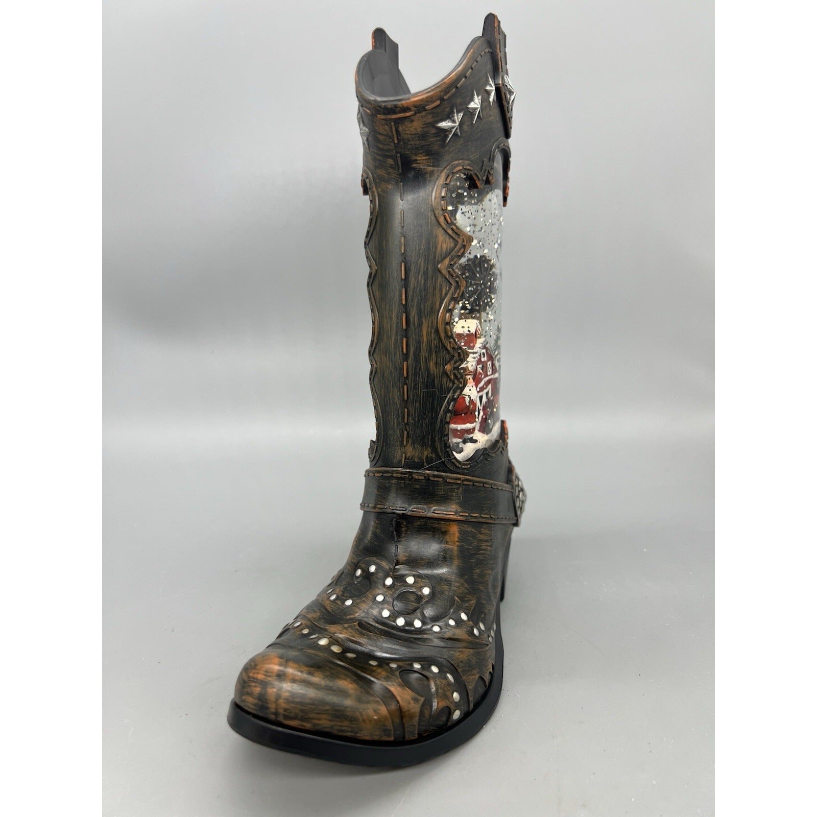 This Cowboy Boot Lighted Swirl Water Glitter Musical Santa with Boy Snow Globe is a festive and whimsical addition to your Christmas decor. With a colorful design featuring Santa and a boy, this plastic snow globe is illuminated with LED lights and plays a musical tune. The battery-operated item measures 8" in length, 10" in height, and 3 1/2" in width, making it suitable for any room in your home. Perfect for adding a touch of country style to your holiday celebrations.