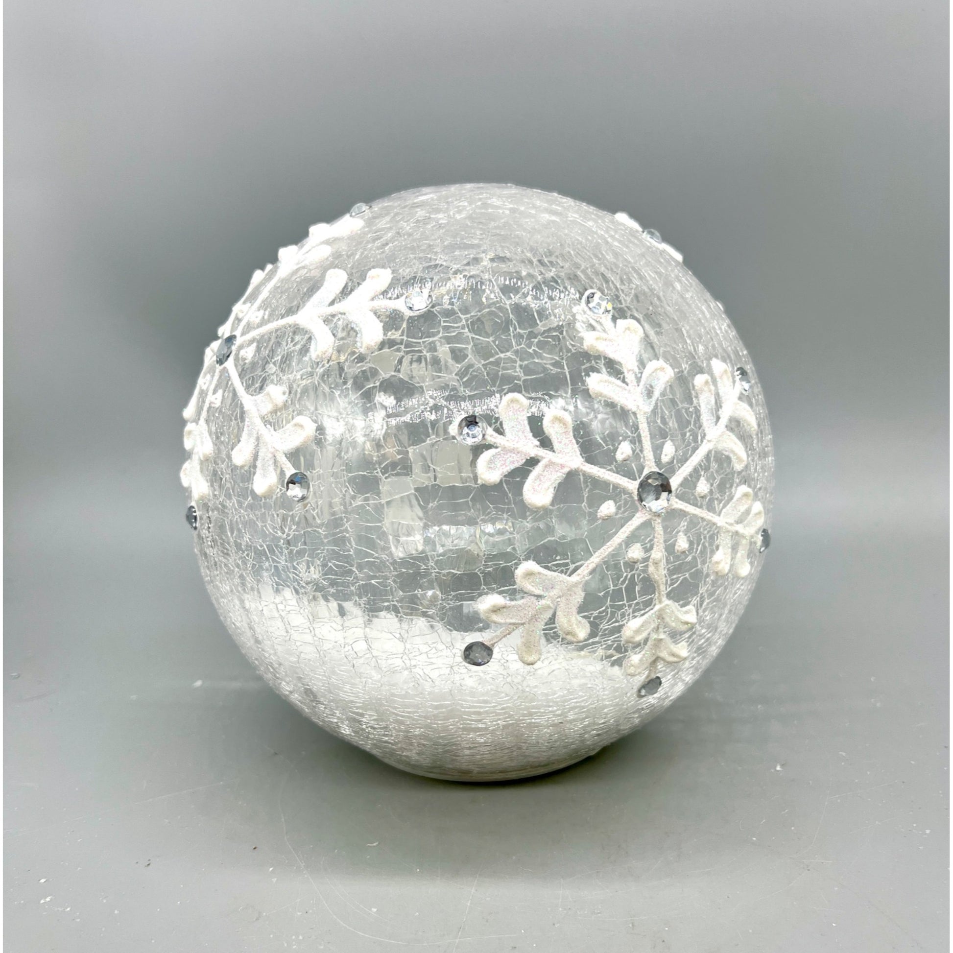 This crackle glass globe features intricate snowflake designs and embedded LED lights, creating a warm, ambient glow. Its elegant frosted finish and subtle sparkle make it a sophisticated seasonal decoration for your home or office.