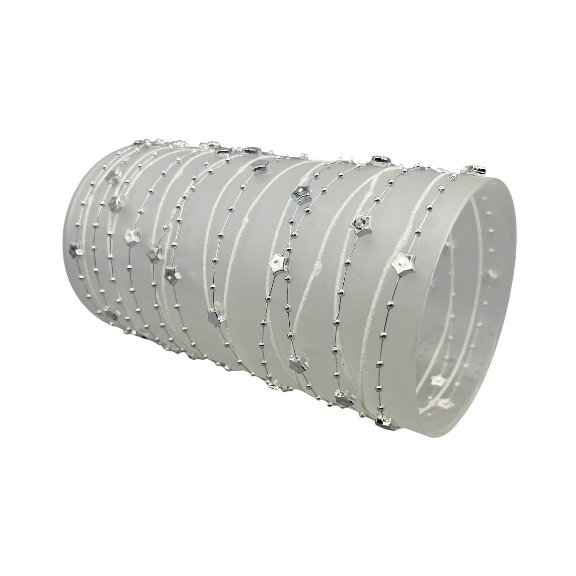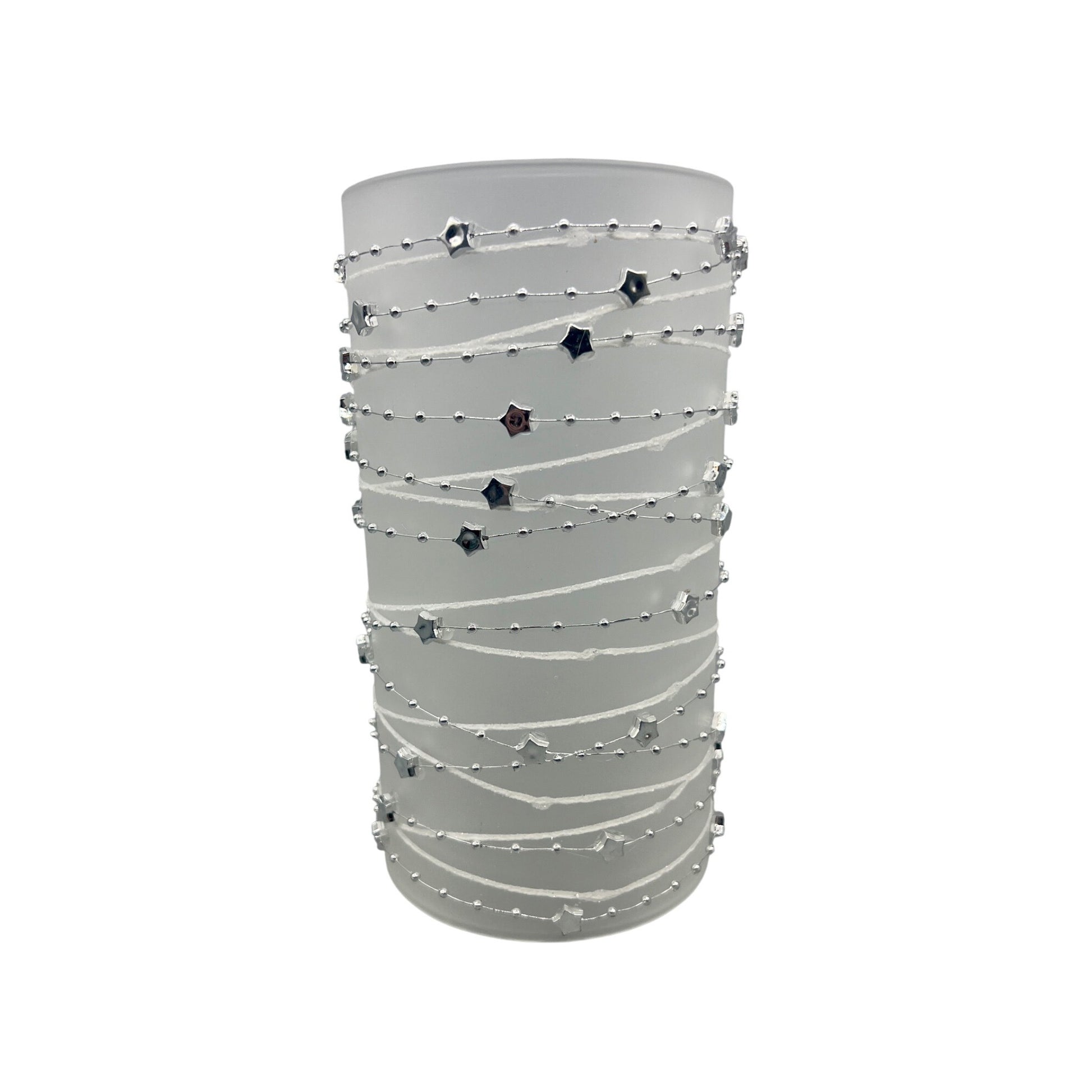 This frosted glass candle sleeve adds sophistication to any setting. The silver star and bead garland design enhances its aesthetic appeal. Suitable for 8" candles, it creates a warm and inviting ambiance.