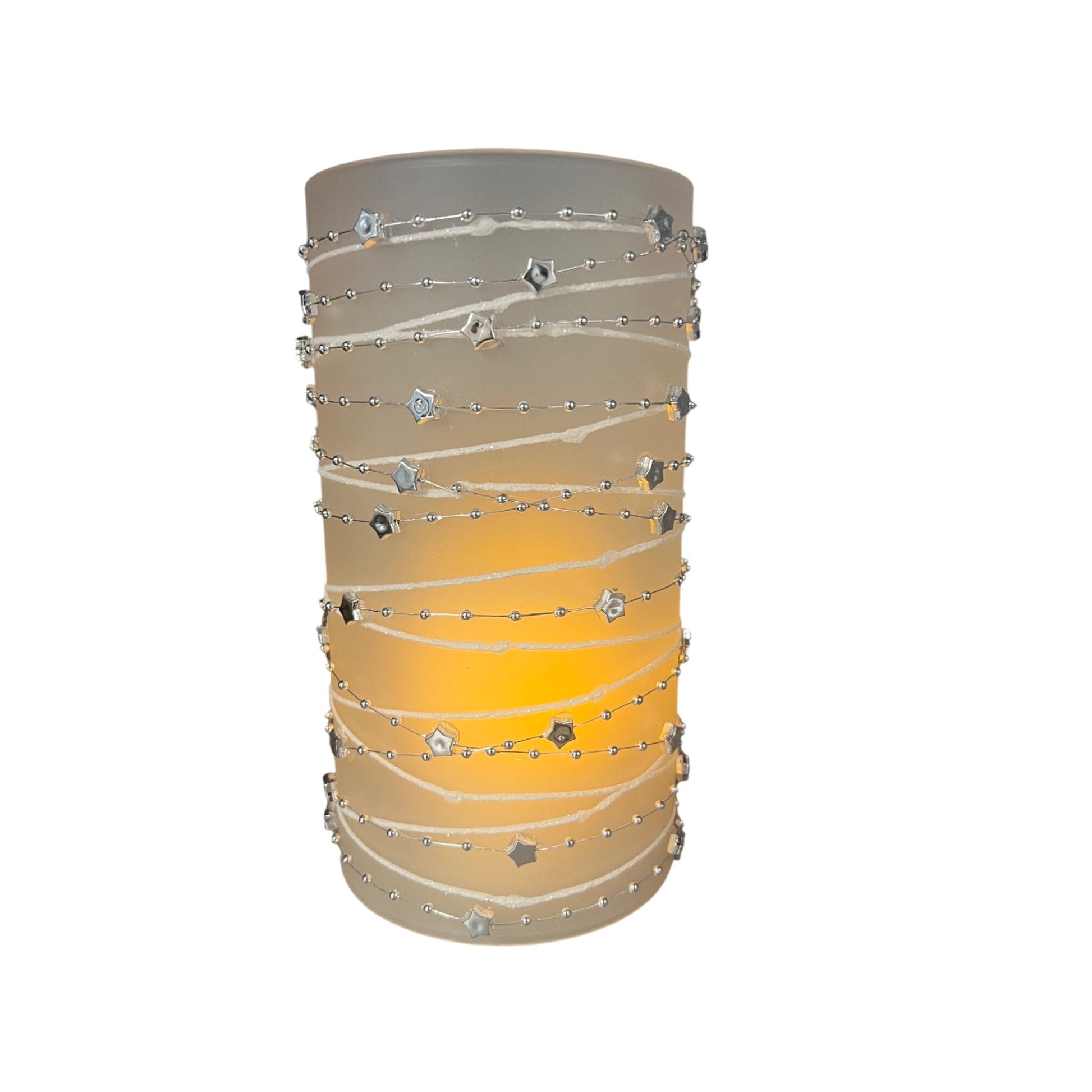 Frosted Glass Candle Sleeve With Silver Star & Bead Garland Design 8" Tall Elegant Decor