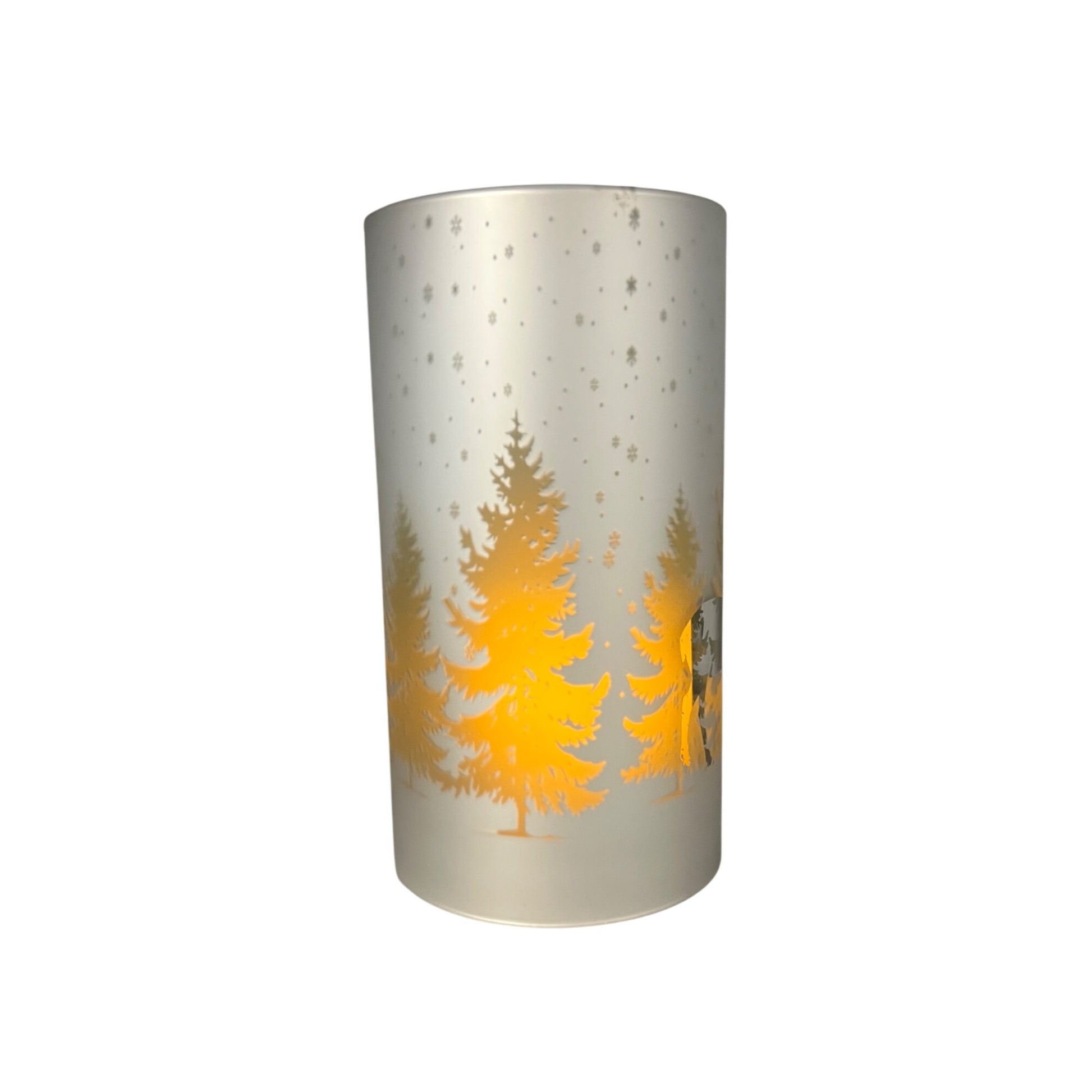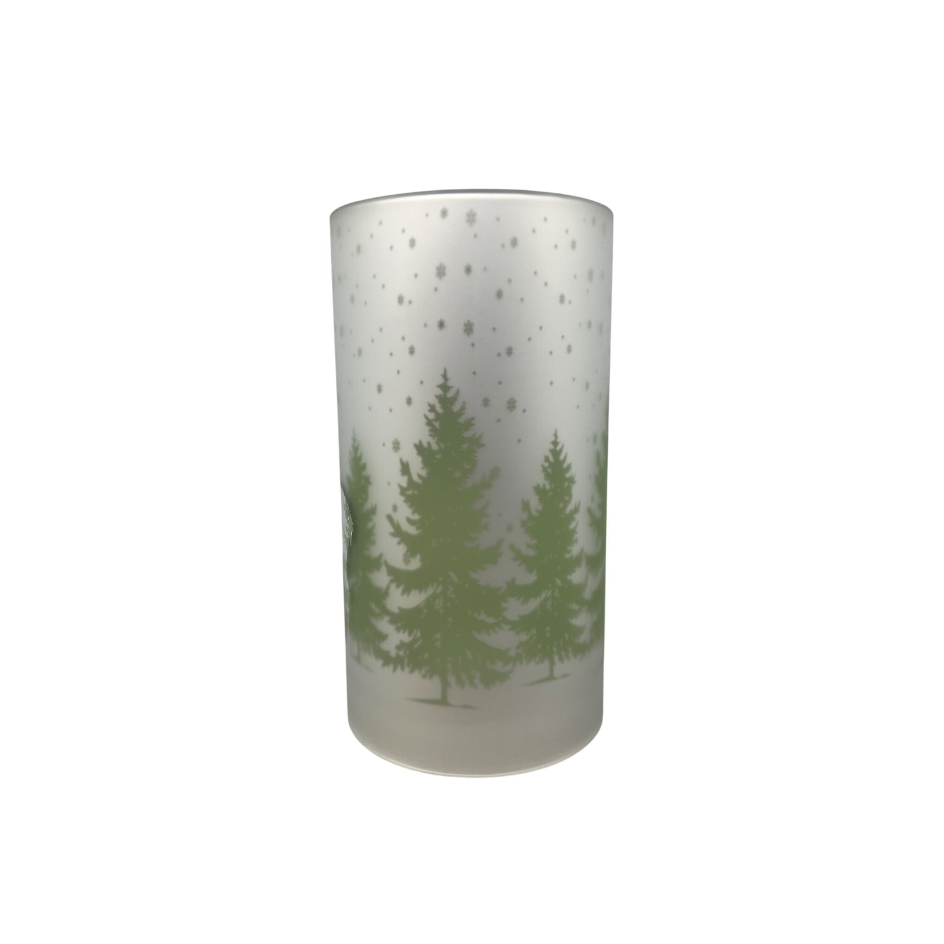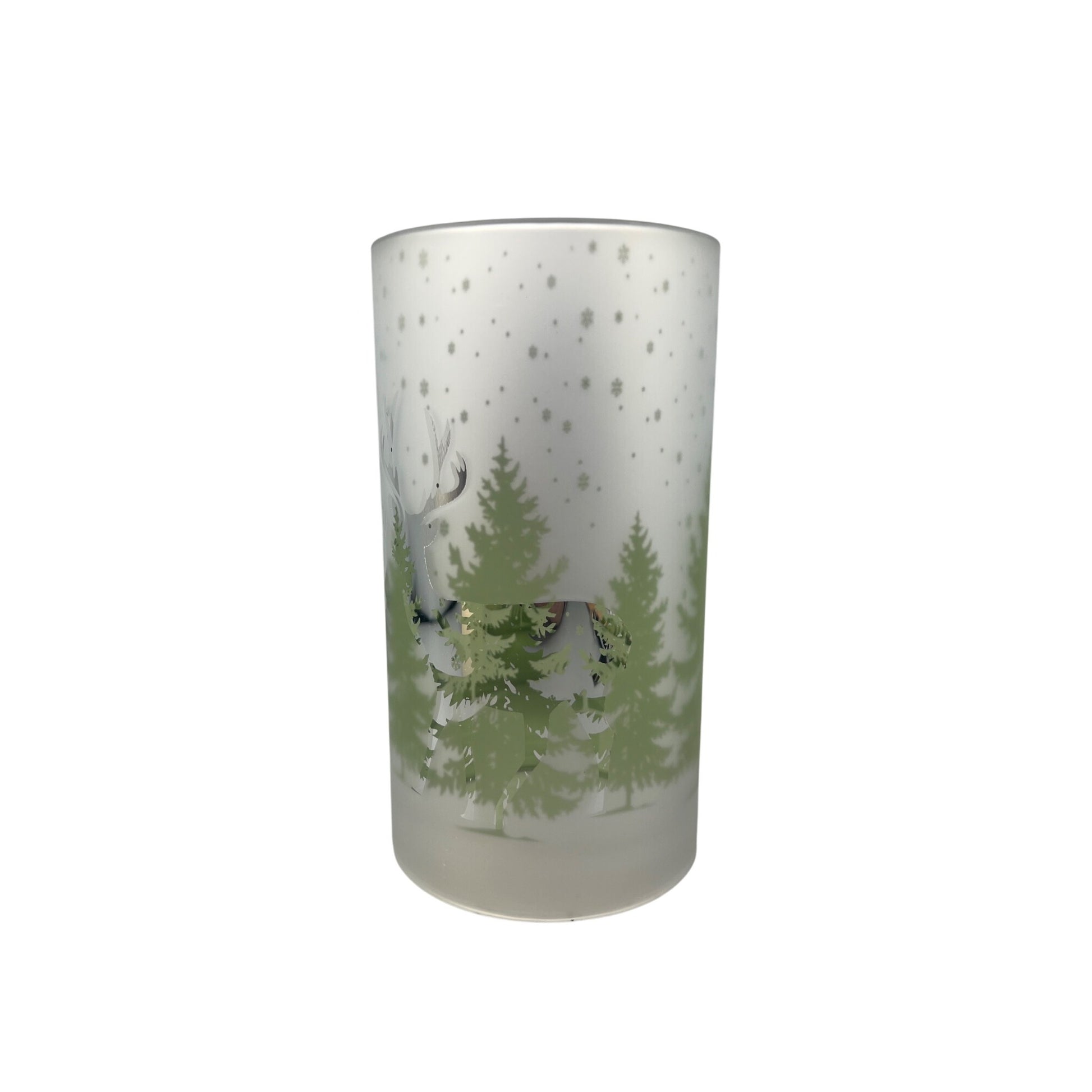 Frosted Glass Winter Scene Deer Candle Sleeve 7.75" White & Green Snowy Forest Design Home Décor