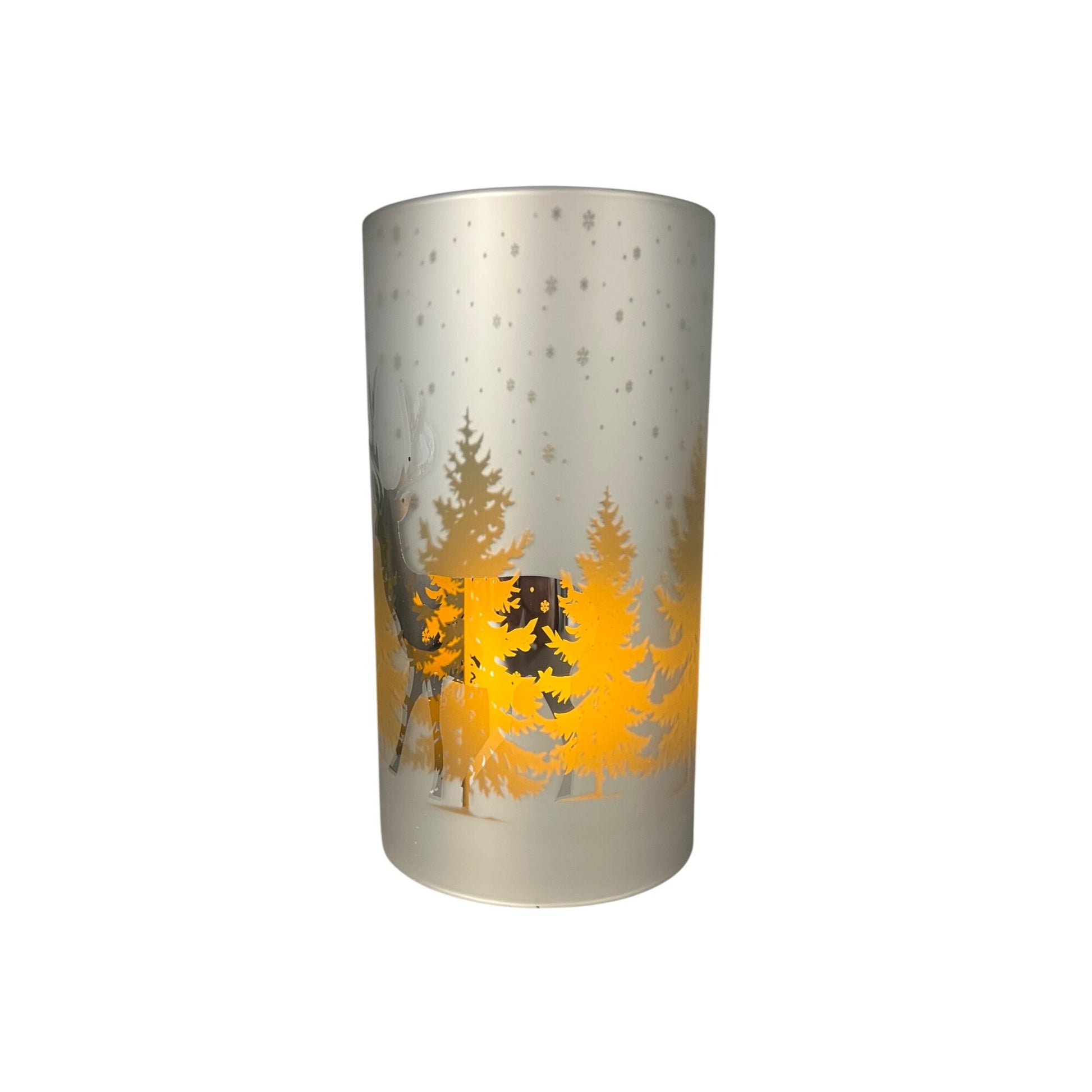 This frosted glass candle sleeve showcases a serene winter forest scene with deer and snowflakes, creating a warm and elegant ambiance.