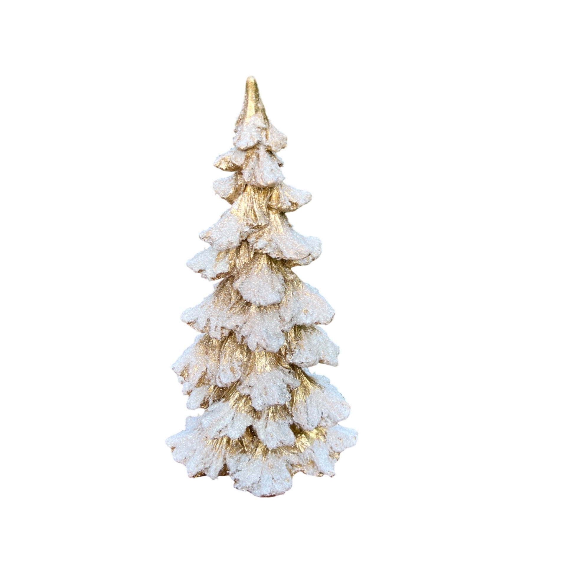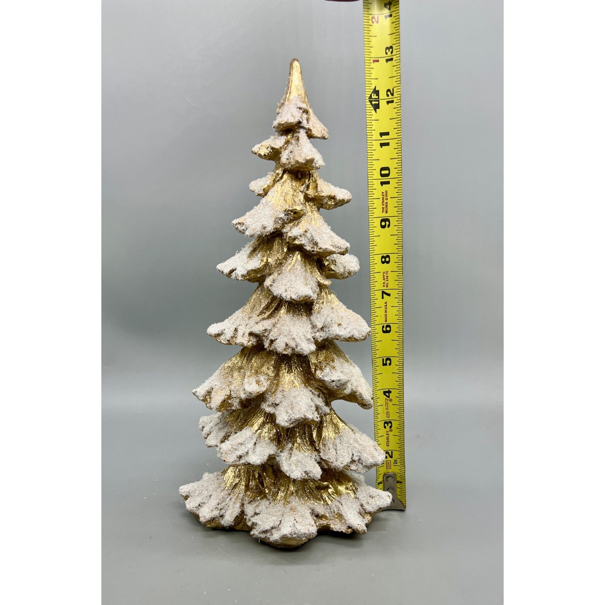 Gold & White Glitter Snowy Christmas Tree Figurine 13.25" Tall Decorative Holiday Accent