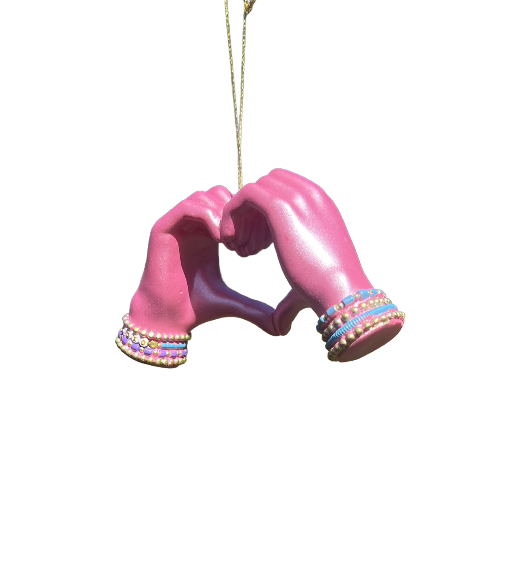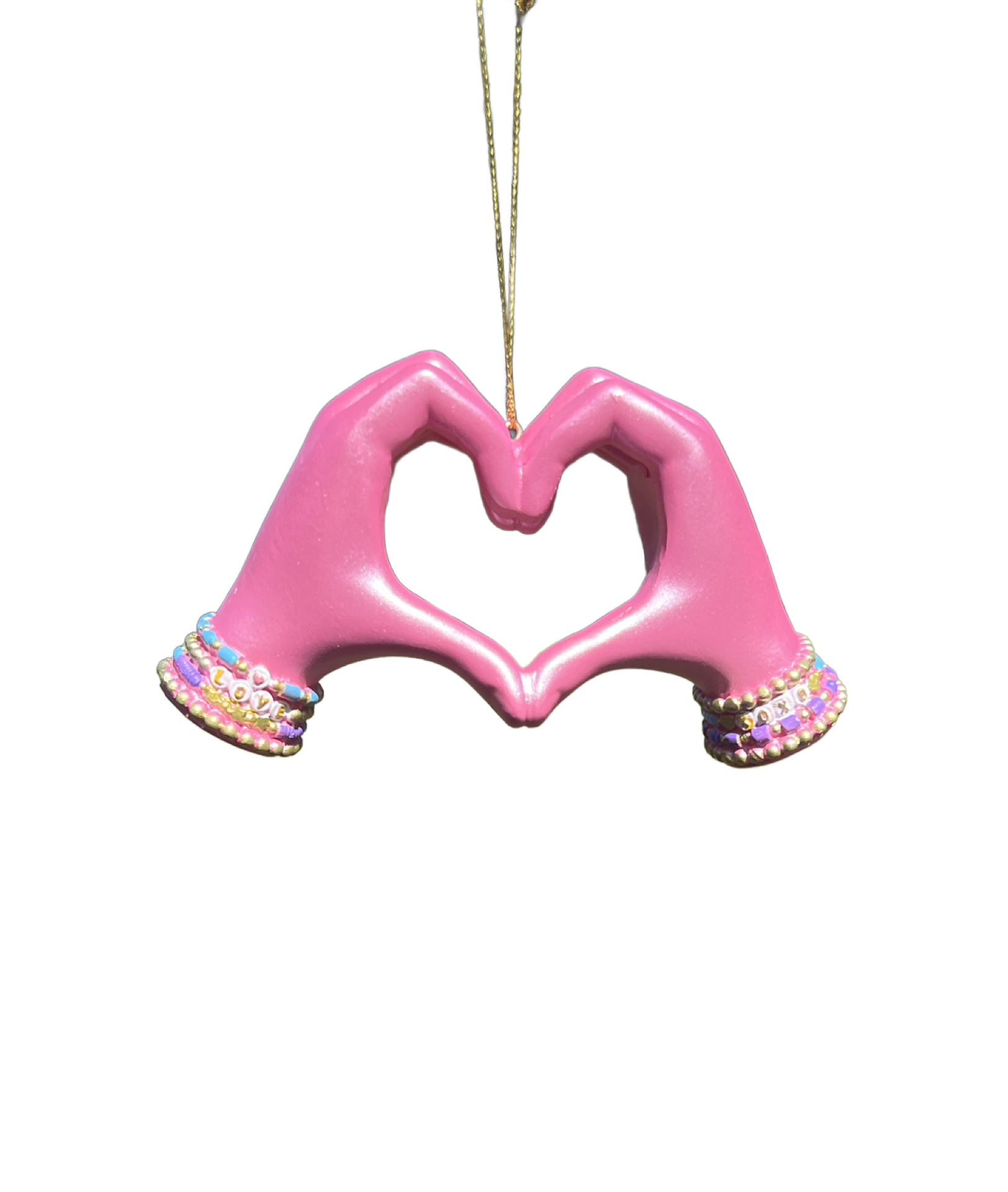 Spread love and joy with this 5" Kurt Adler pink hand heart ornament. Featuring two hands forming a heart shape with colorful beaded "LOVE" bracelets, this playful and vibrant decoration adds a fun, modern twist to your holiday décor. Perfect for gifting, spreading positivity, or adding a pop of color to your Christmas tree. Made of durable resin and ready to hang.