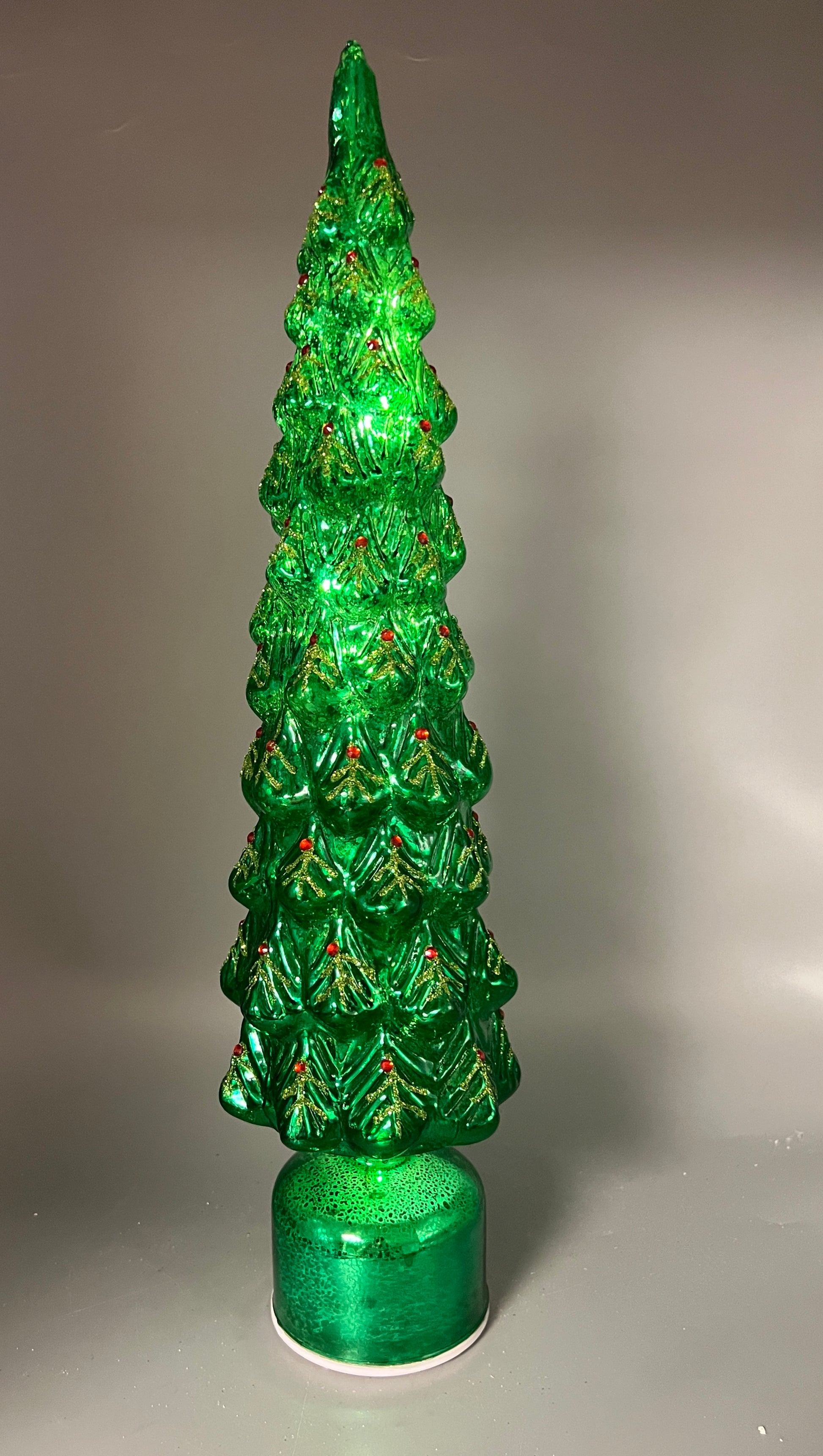 Add a festive glow to your holiday décor with this LED Rotating Green Christmas Tree, available in 19" or 16" sizes and sold separately. Crafted with intricate detailing and a smooth rotating base, this tree creates a magical light display perfect for tabletops, mantels, or entryways. Runs on 3 AA batteries (not included) for easy placement anywhere in your home.
