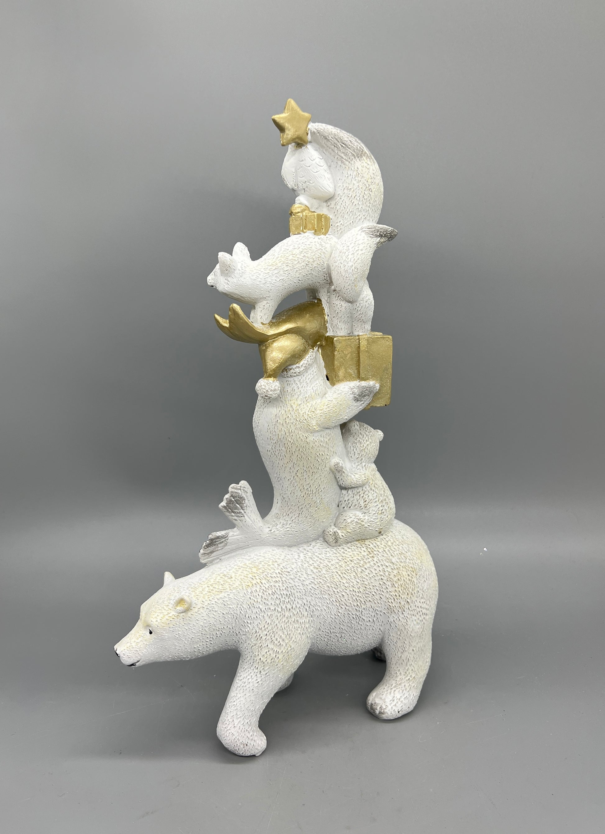 Add whimsical winter charm to your holiday décor with this 13" Polar Bear and Arctic Animals Stacked with Gifts Christmas Figurine. Featuring a glittering white polar bear carrying a playful tower of arctic friends—including smaller bears, foxes, and a Santa figure—this festive piece is accented with shimmering gold details and presents. Perfect for displaying on a mantel, shelf, or holiday table, it brings a touch of Arctic magic and seasonal cheer to any Christmas setting. Ideal for animal lovers and collectors of unique holiday decorations.