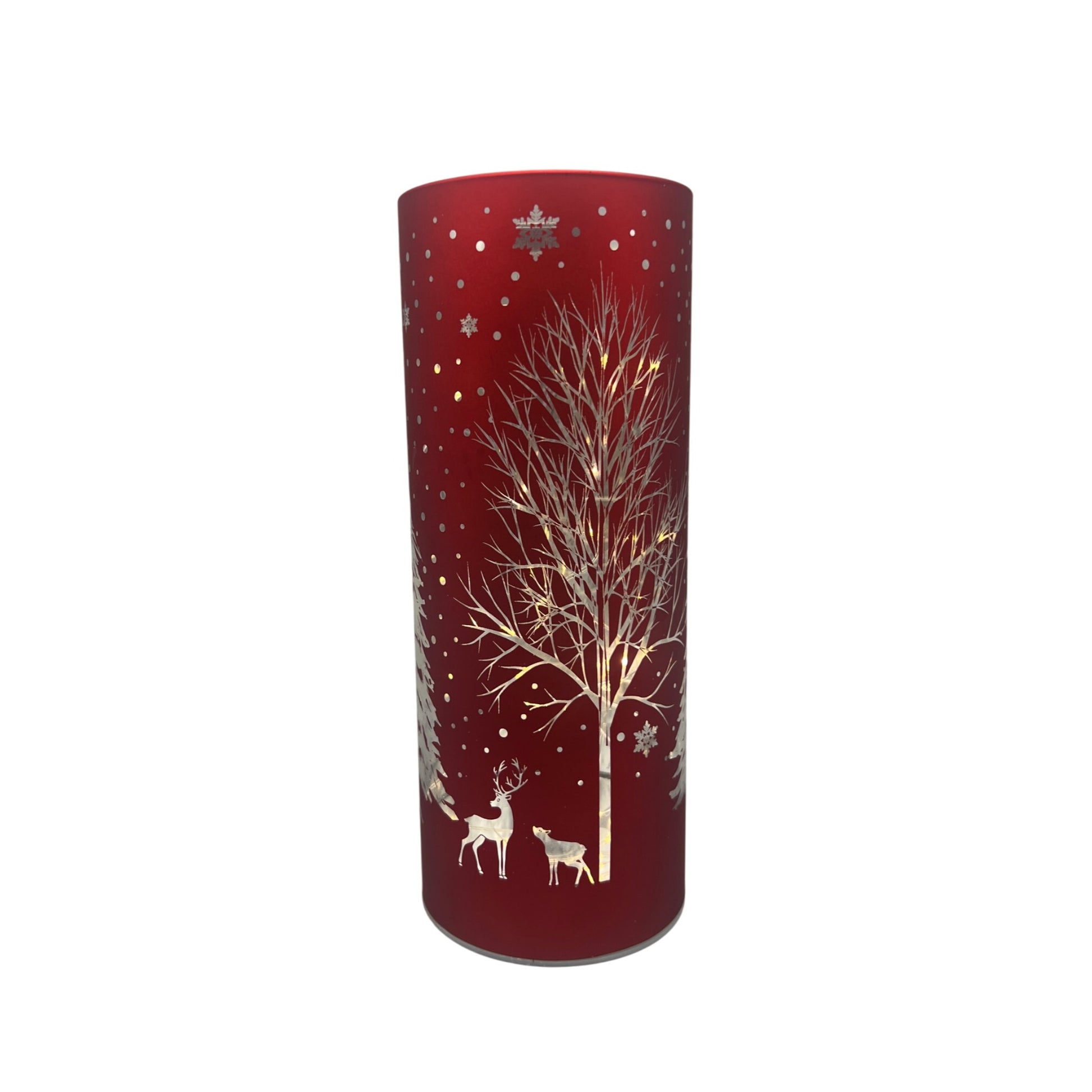 Red Laser Engraved Winter Scene LED Cylinder 8" With Deer & Trees Battery Operated Holiday Decor Accent Piece