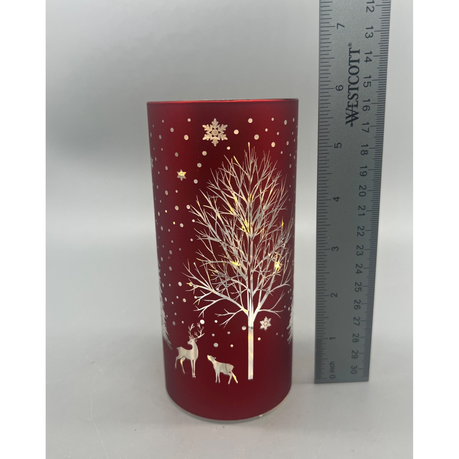 Red Laser Engraved Winter Scene LED Cylinder With Deer & Snowflakes Design 6" Tall