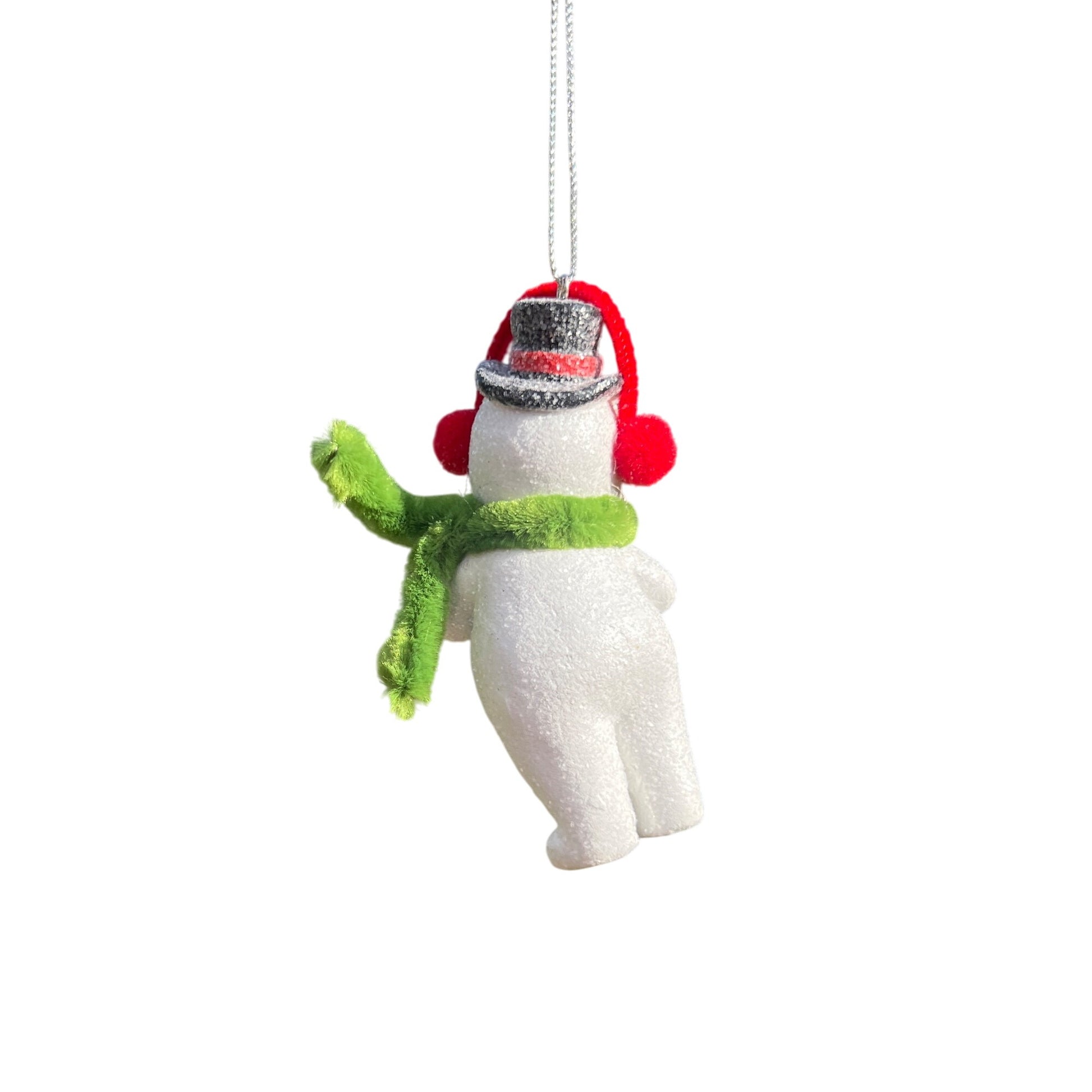 This vintage-inspired snowman ornament adds a touch of classic holiday charm. Its glitter finish and playful design make it a standout seasonal decoration.