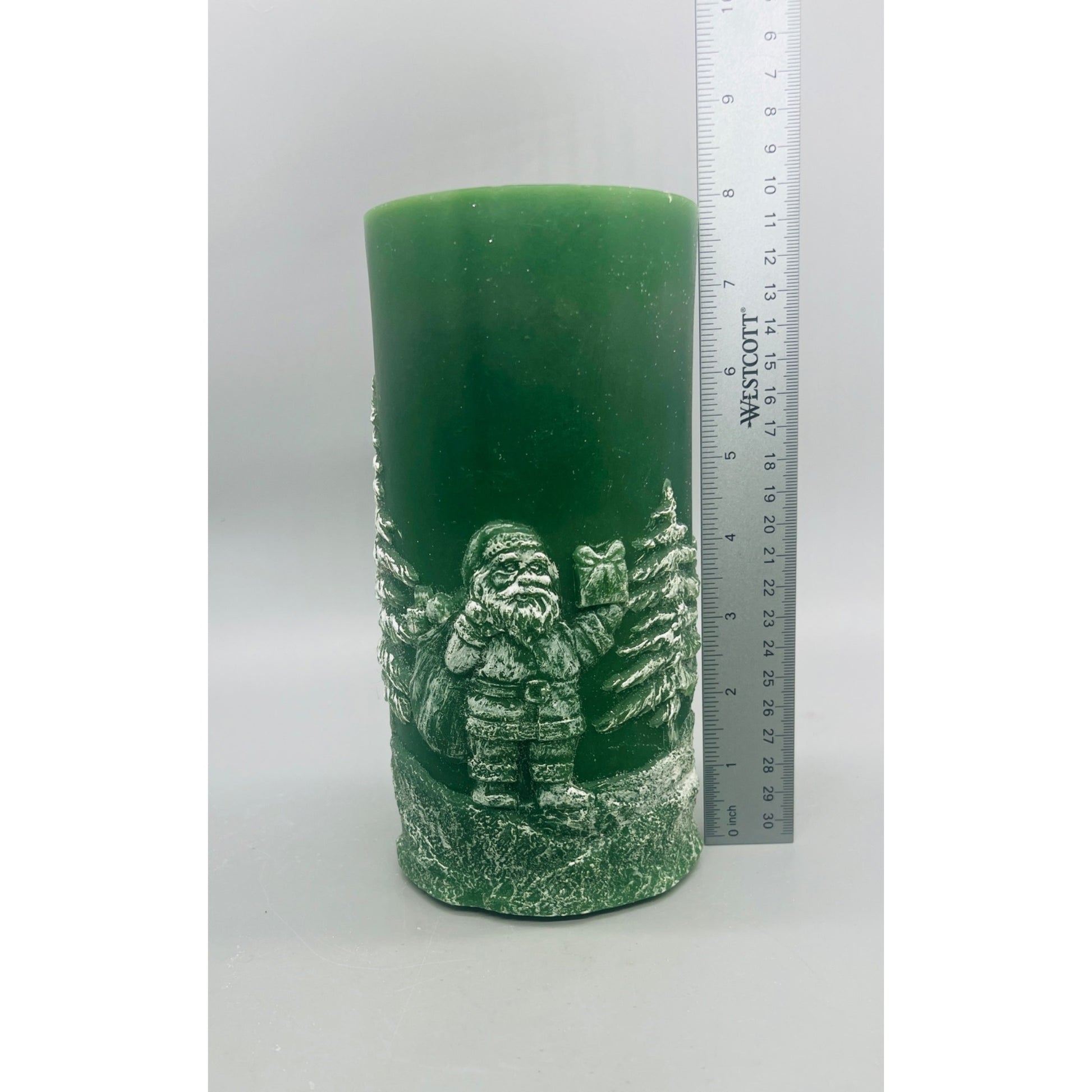 Santa & Evergreen Fountain Candle 8" Green Wax Pillar With White Holiday Design