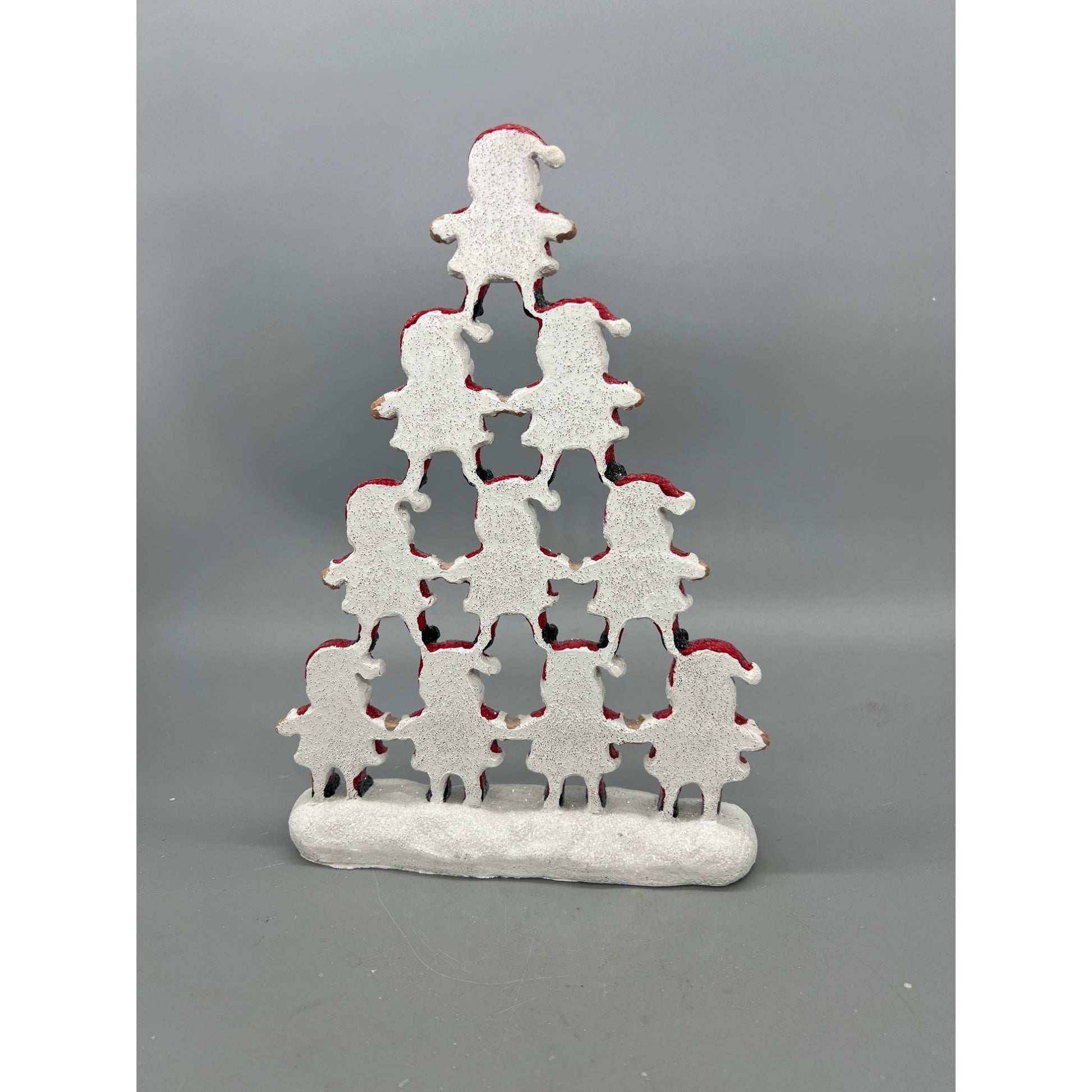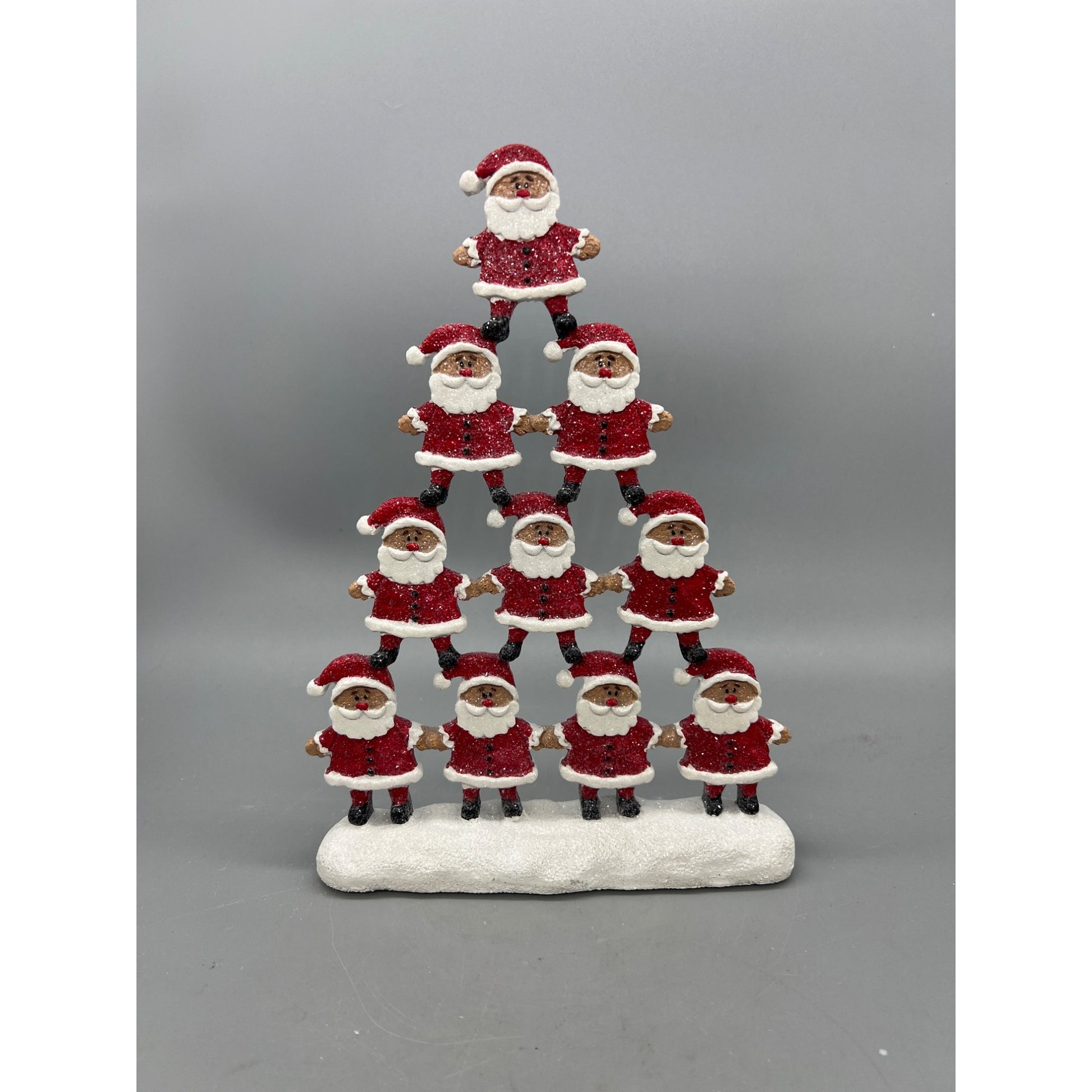 • Features a pyramid of stacked Santa figures