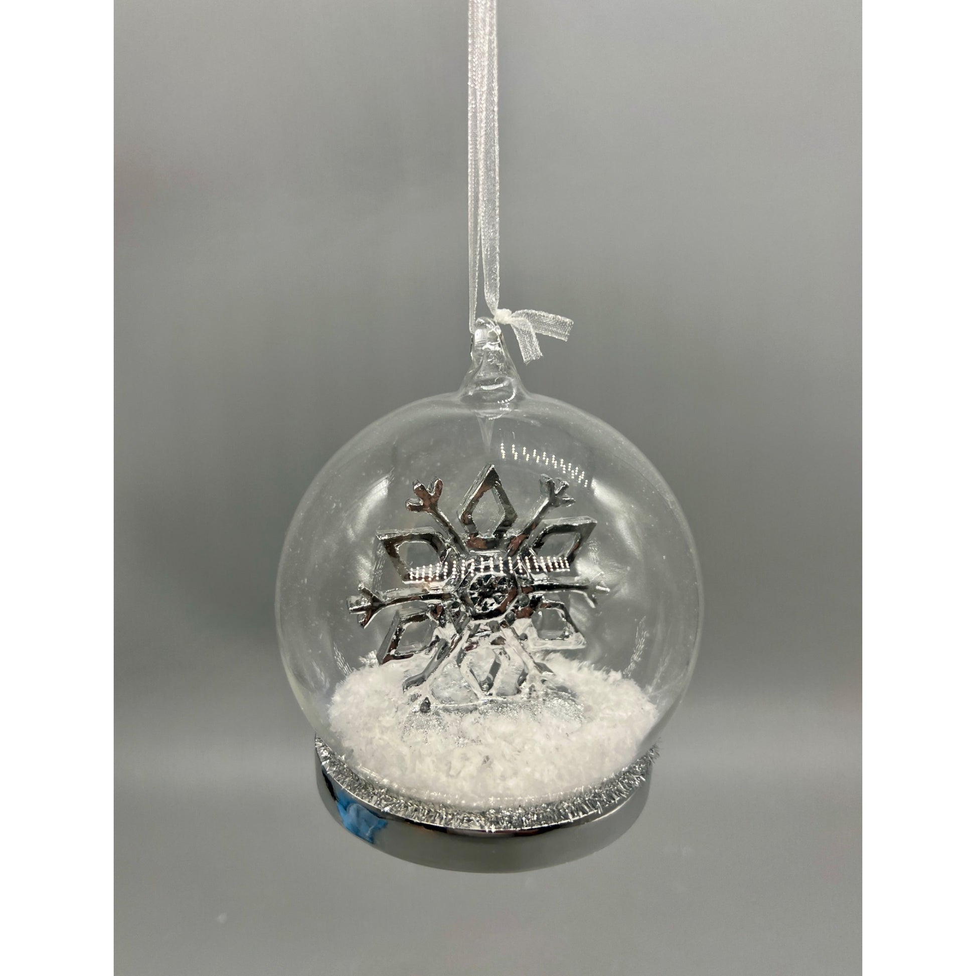 This elegant ornament features a detailed silver snowflake encased in a transparent globe with faux snow, perfect for adding a touch of sophistication to your holiday decorations. A ribbon hanger completes the design for easy display.