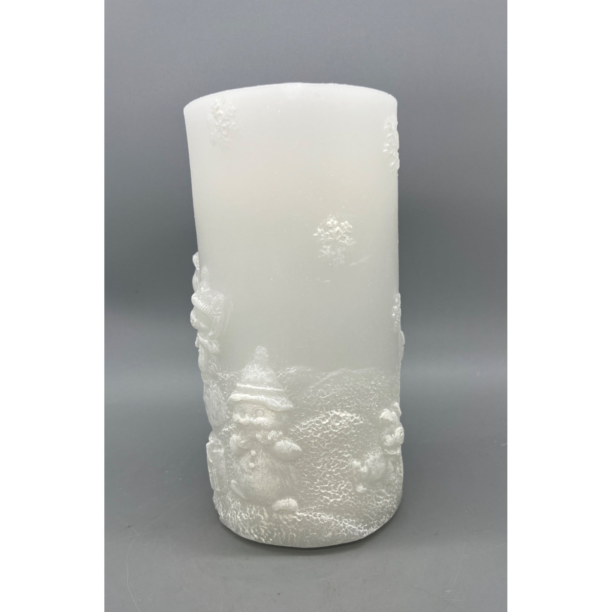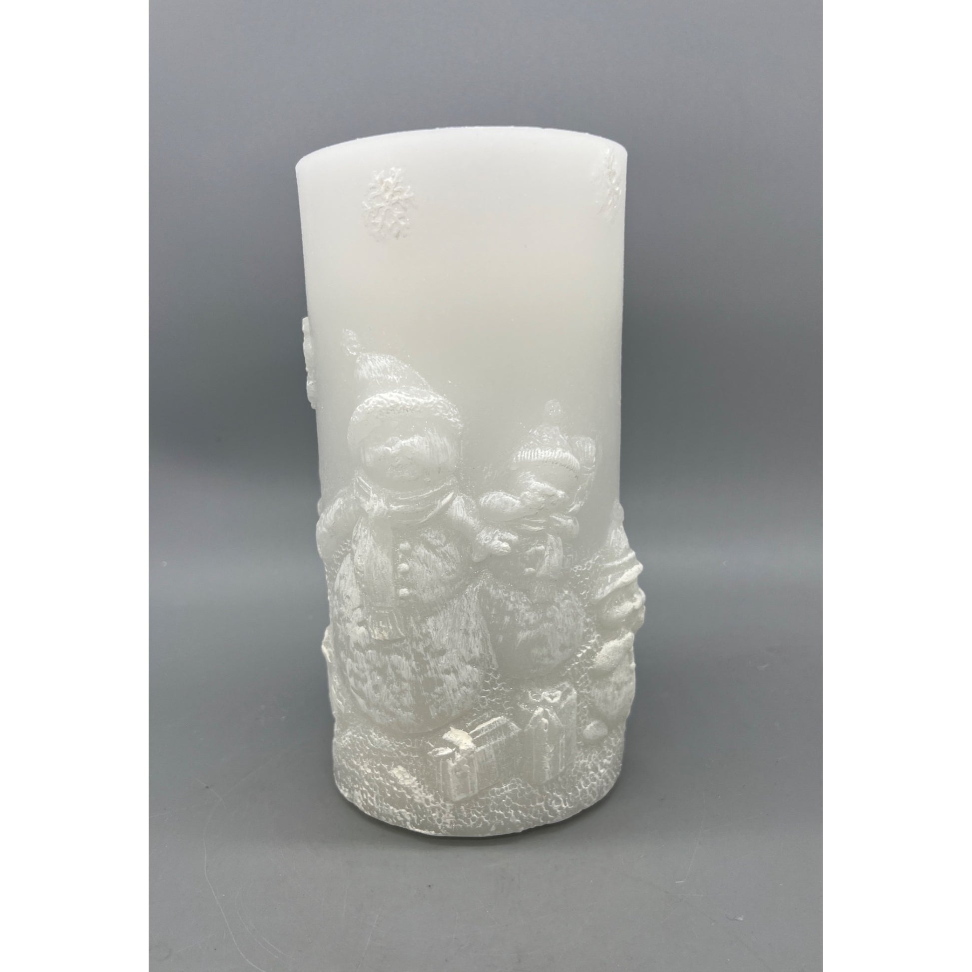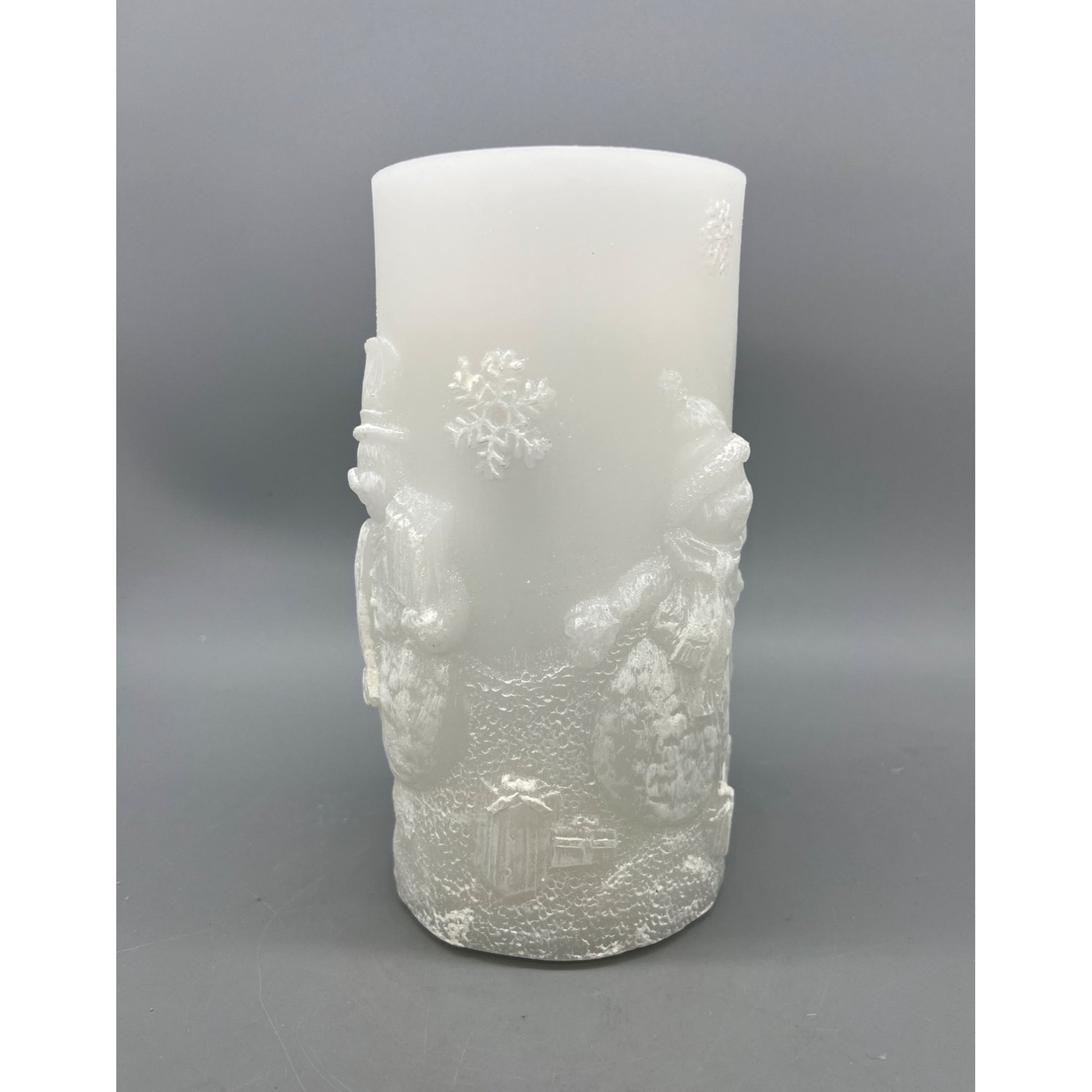 Snowman Embossed LED Flameless Fountain Candle 8" Tall White Frosted Glow Winter Décor Battery Operated