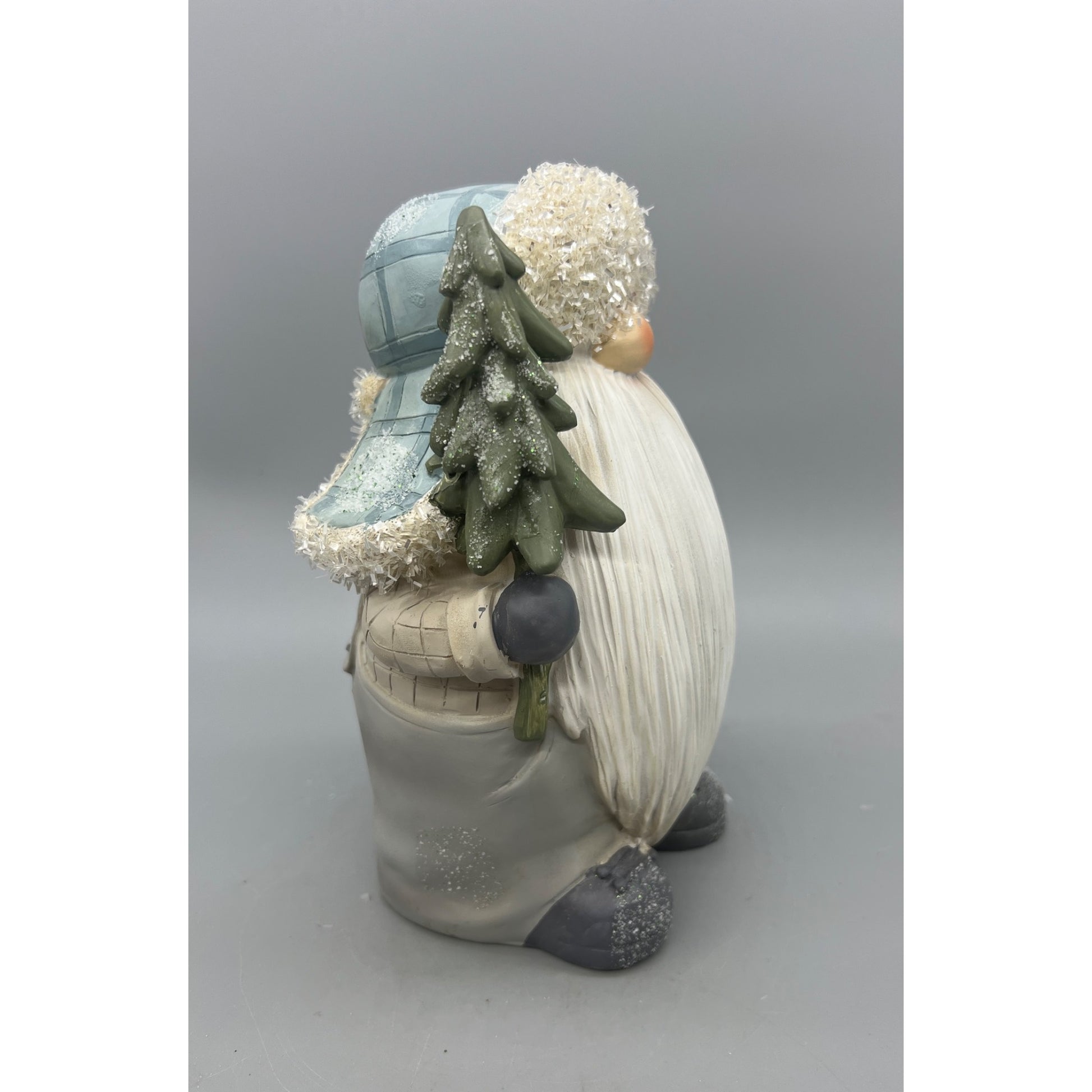Snowy Winter Gnome Figurine With Tree 8" Tall Hand-Painted Resin Holiday Decor