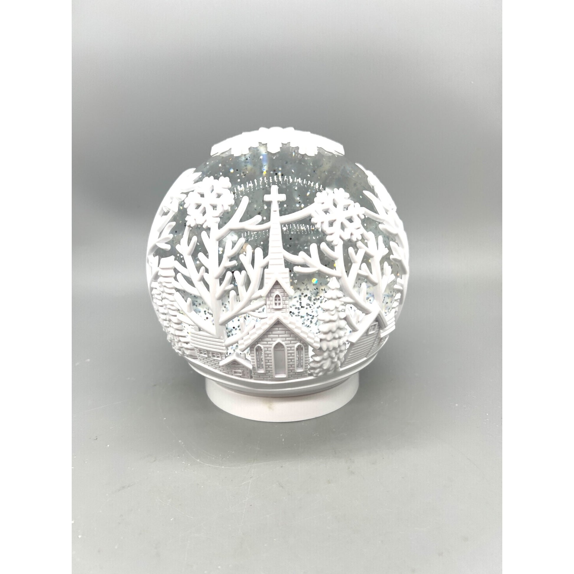 White Acrylic LED Spinning Water Globe With Church Scene & Snowflake Design 6.5”