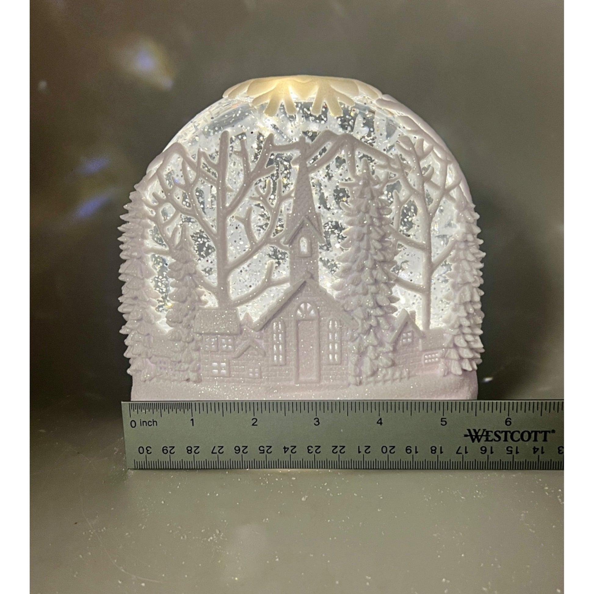 This elegant LED water spinner features a classic white church scene, adding a serene ambiance. Its 6-hour timer ensures effortless operation, while the acrylic construction and intricate cutout details enhance durability and aesthetic appeal. A perfect addition to seasonal décor or as an accent piece.
